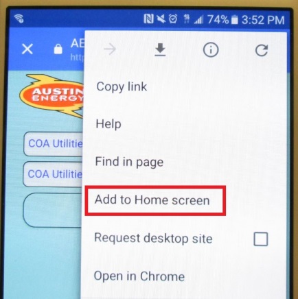 1. Use a web browser on your Android Phone to go to AustinEnergyApp.com and then tap on the “3 dot” menu icon of your Android Phone screen.